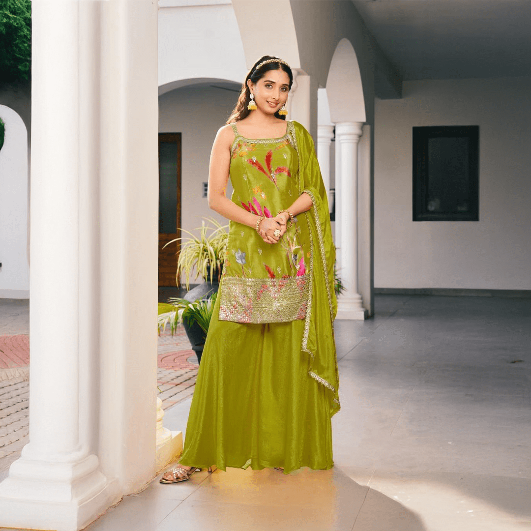 Step into a world of enchanting style and festive elegance with our Green Garden Sharara Set. This stunning ensemble is a celebration of vibrant color and delicate craftsmanship, perfect for weddings, celebratory functions, and special occasions where you want to make a graceful statement.