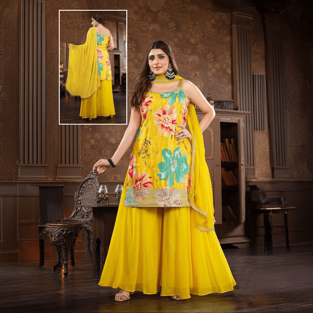 Step into a world of vibrant sunshine and festive elegance with our Lemon Bloom Sharara Set. This stunning ensemble is a celebration of joyful color and delicate craftsmanship, perfect for weddings, celebratory functions, and special occasions where you want to make a radiant statement.
