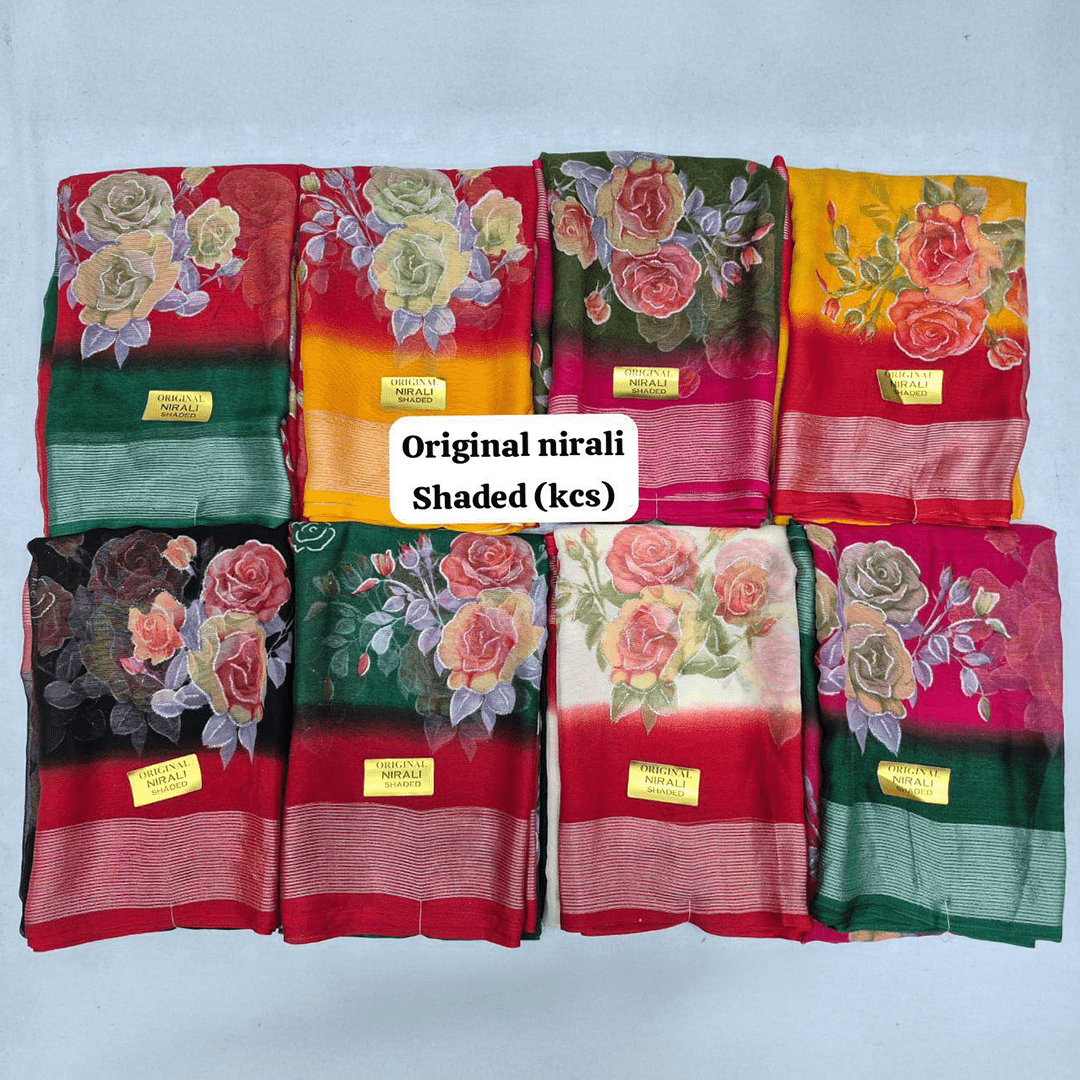 Step into a world of artistic flair and stunning color with the Original Nirali Shaded (Kcs) saree collection. This line is a beautiful blend of traditional floral prints and modern shaded designs, perfect for the woman who loves a saree that is both unique and elegant. Each piece is a masterpiece of craftsmanship, combining the beauty of a garden with a sophisticated color palette.
